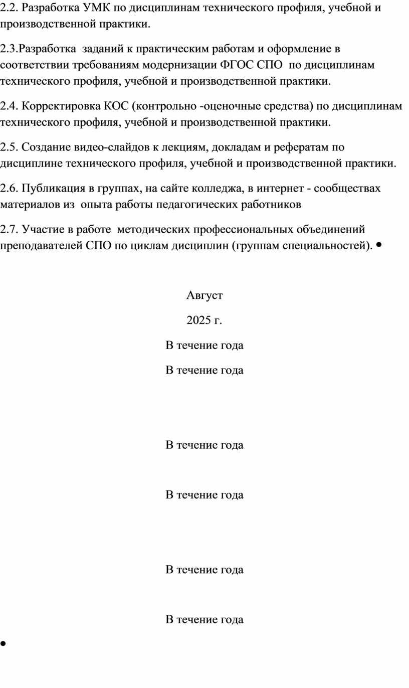 Методическая работа 2.1. Корректировка рабочих программ учебных дисциплин в соответствии с ФГОС СПО. 2.2. Разработка УМК по дисциплинам технического профиля, учебной и производственной практики. 2.3.Разработка заданий к практическим работам и оформление в соответствии требованиям модернизации ФГОС СПО по дисциплинам технического профиля, учебной и производственной практики. 2.4. Корректировка КОС (контрольно -оценочные средства) по дисциплинам технического профиля, учебной и производственной практики. 2.5. Создание видео-слайдов к лекциям, докладам и рефератам по дисциплине технического профиля, учебной и производственной практики. 2.6. Публикация в группах, на сайте колледжа, в интернет - сообществах материалов из опыта работы педагогических работников 2.7. Участие в работе методических профессиональных объединений преподавателей СПО по циклам дисциплин (группам специальностей). |