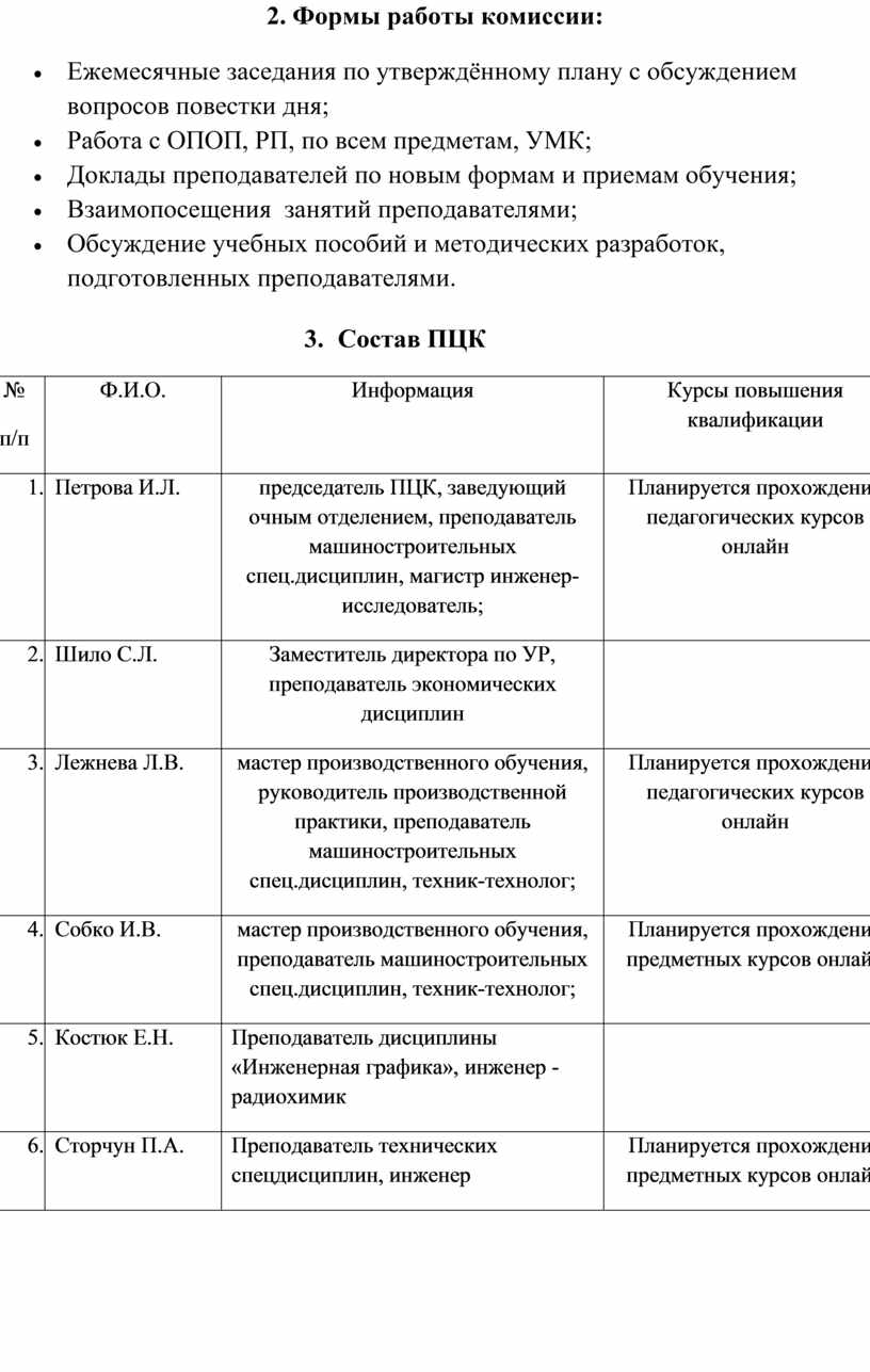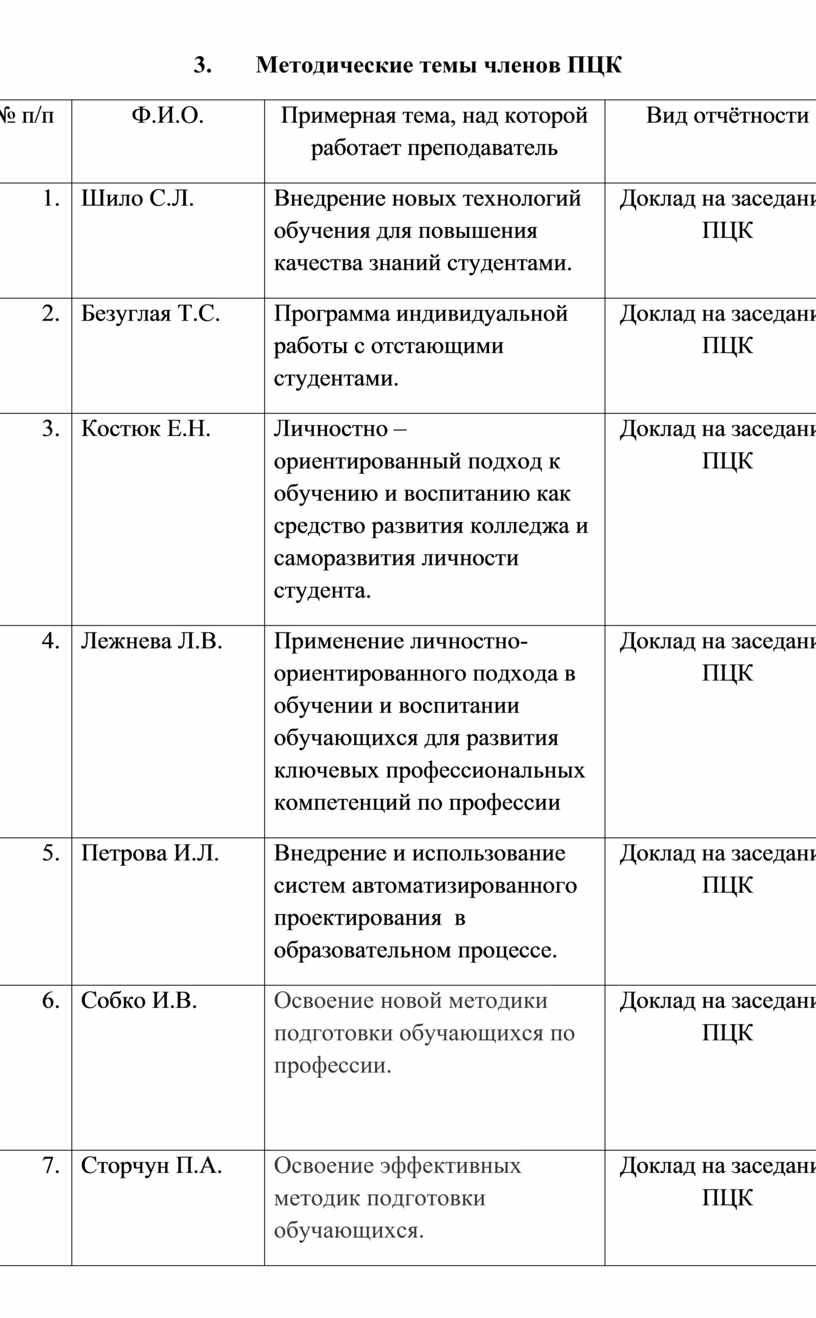 Примерный перечень вопросов, выносимых на заседание ПЦК |