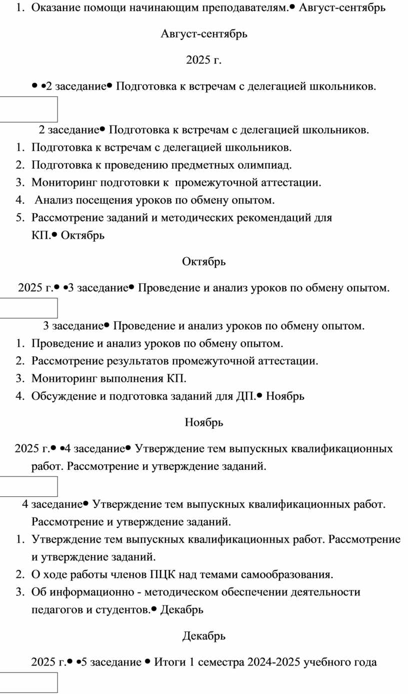 1. Подготовка учебных кабинетов. 2. Рассмотрение, обсуждение, утверждение на 2025-2026 уч.год: 1) Рабочих программ учебных дисциплин. 2) Рабочих программ междисциплинарных курсов (МДК) 3) Учебных (УП) и производственных (ПП) практик. 3. Разработка практических занятий, содержания учебного материала дисциплин для самостоятельной работы студентов. 4. Утверждение методических тем членов ПЦК. 5. Утверждение индивидуальных планов и плана ПЦК на год. 6. Оказание помощи начинающим преподавателям. |