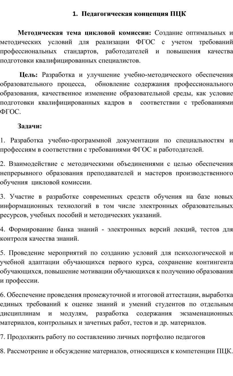 Методическая тема цикловой комиссии: Создание оптимальных и методических условий для реализации ФГОС с учетом требований профессиональных стандартов, работодателей и повышения качества подготовки квалифицированных специалистов.
