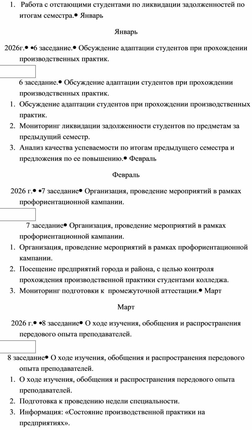 1. Обсуждение адаптации студентов при прохождении производственных практик. 2. Мониторинг ликвидации задолженности студентов по предметам за предыдущий семестр. 3. Анализ качества успеваемости по итогам предыдущего семестра и предложения по ее повышению. |