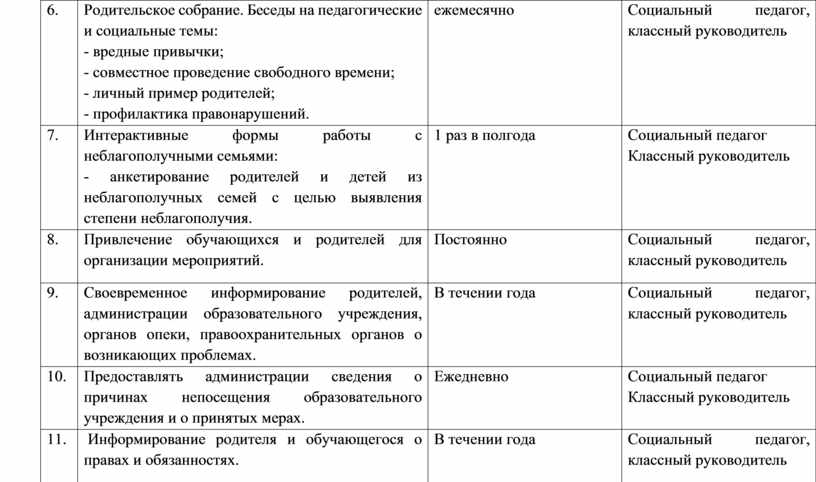Своевременное информирование родителей, администрации образовательного учреждения, органов опеки, правоохранительных органов о возникающих проблемах. |