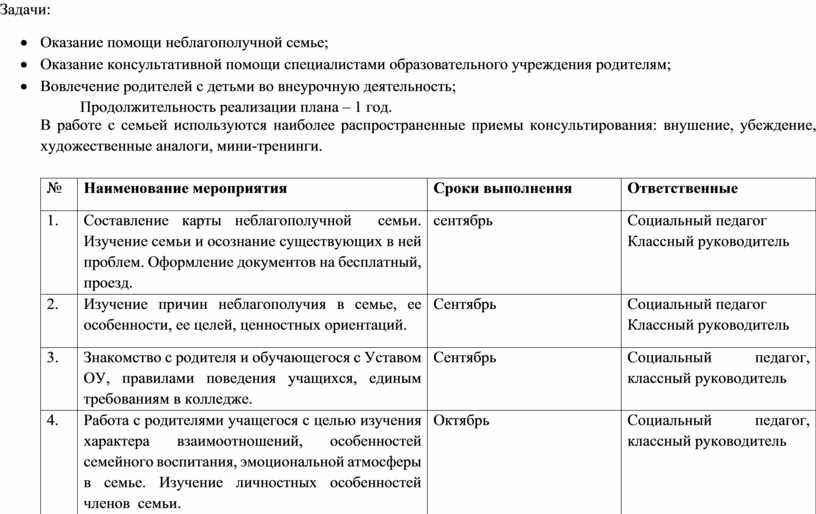 Составление карты неблагополучной семьи. Изучение семьи и осознание существующих в ней проблем. Оформление документов на бесплатный, проезд. |