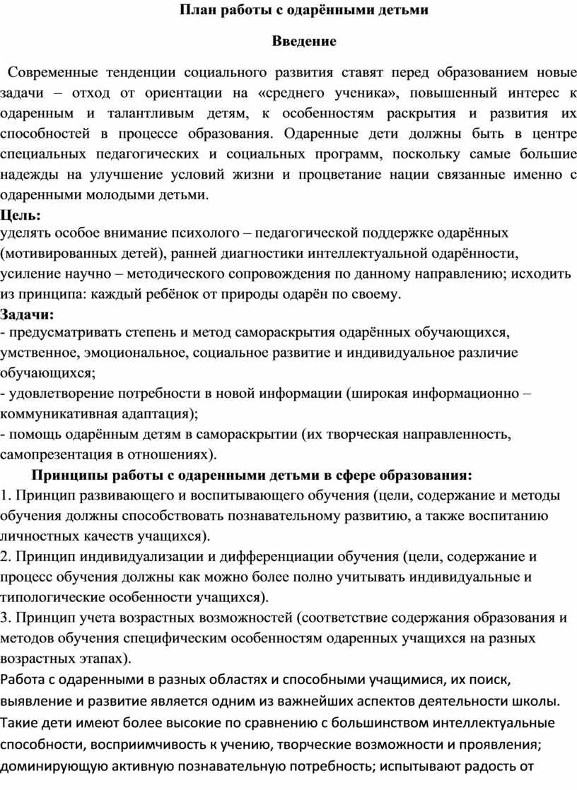 Современные тенденции социального развития ставят перед образованием новые задачи – отход от ориентации на «среднего ученика», повышенный интерес к одаренным и талантливым детям, к особенностям раскрытия и развития их способностей в процессе образования. Одаренные дети должны быть в центре специальных педагогических и социальных программ, поскольку самые большие надежды на улучшение условий жизни и процветание нации связанные именно с одаренными молодыми детьми.