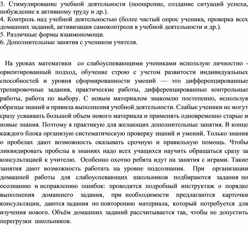На уроках математики со слабоуспевающими учениками использую личностно - ориентированный подход, обучение строю с учетом развитости индивидуальных способностей и уровня сформированности умений — это дифференцированные тренировочные задания, практические работы, дифференцированные контрольные работы, работа по выбору. С новым материалом знакомлю постепенно, используя образцы знаний и правила выполнения учебной деятельности. Слабые ученики не могут сразу усваивать большой объем нового материала и применять одновременно старые и новые знания. Поэтому я практикую для желающих дополнительные занятия. В конце каждого блока организую систематическую проверку знаний и умений. Только знания о пробелах дают возможность оказывать срочную и правильную помощь. Чтобы ликвидировать пробелы в знаниях надо всех учащихся научить обращаться сразу за консультацией к учителю. Особенно охотно ребята идут на занятия с играми. Такие занятия дают возможность работать на уровне подсознания. При организации домашней работы для слабоуспевающих школьников подбираются задания по осознанию и исправлению ошибок: проводится подробный инструктаж о порядке выполнения домашнего задания, при необходимости предлагаются карточки консультации, даются задания по повторению материала, который потребуется для изучения нового. Объём домашних заданий рассчитывается так, чтобы не допустить перегрузки школьников.