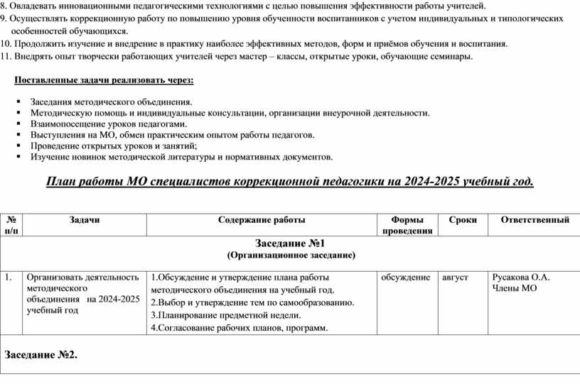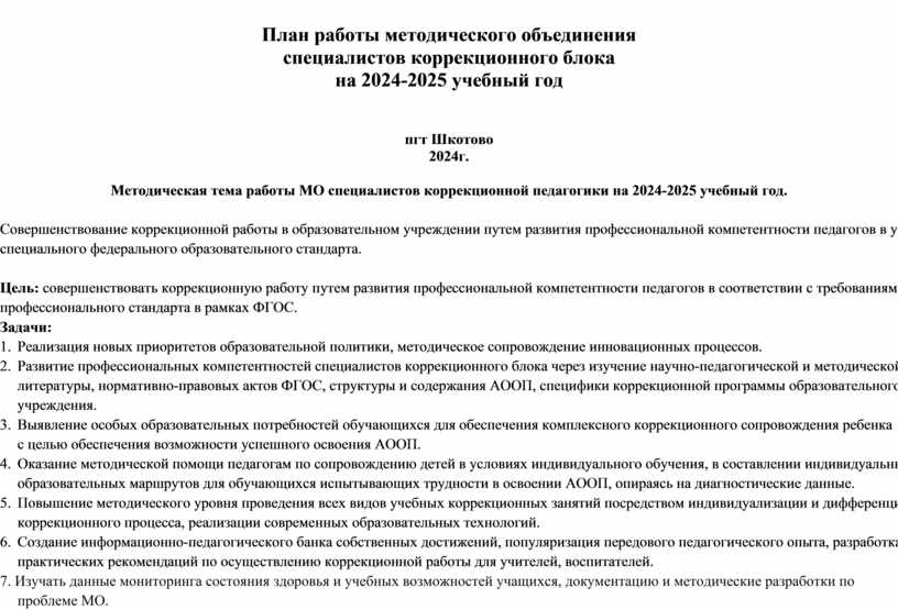 План работы МО специалистов коррекционной педагогики на 2024-2025 учебный год.