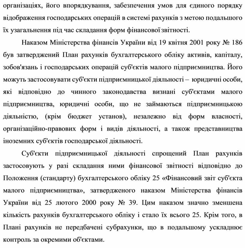 Наказом Міністерства фінансів України від 19 квітня 2001 року № 186 був затверджений План рахунків бухгалтерського обліку активів, капіталу, зобов'язань і господарських операцій суб'єктів малого підприємництва. Його можуть застосовувати суб'єкти підприємницької діяльності – юридичні особи, які відповідно до чинного законодавства визнані суб'єктами малого підприємництва, юридичні особи, що не займаються підприємницькою діяльністю, (крім бюджет установ), незалежно від форм власності, організаційно-правових форм і видів діяльності, а також представництва іноземних суб'єктів господарської діяльності.