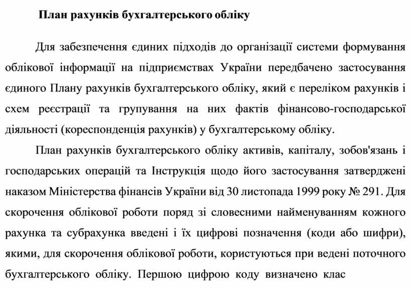 План рахунків бухгалтерського обліку активів, капіталу, зобов'язань і господарських операцій та Інструкція щодо його застосування затверджені наказом Міністерства фінансів України від 30 листопада 1999 року № 291. Для скорочення облікової роботи поряд зі словесними найменуванням кожного рахунка та субрахунка введені і їх цифрові позначення (коди або шифри), якими, для скорочення облікової роботи, користуються при ведені поточного бухгалтерського обліку. Першою цифрою коду визначено клас