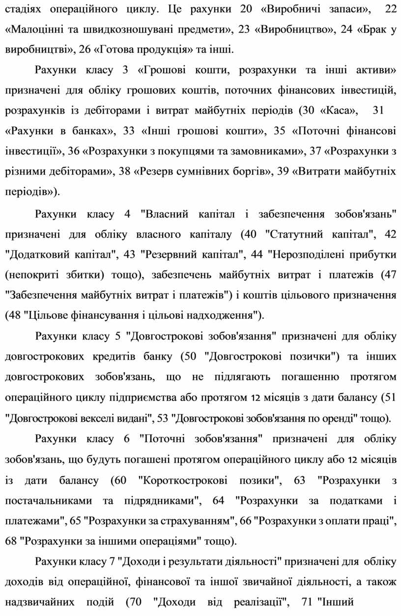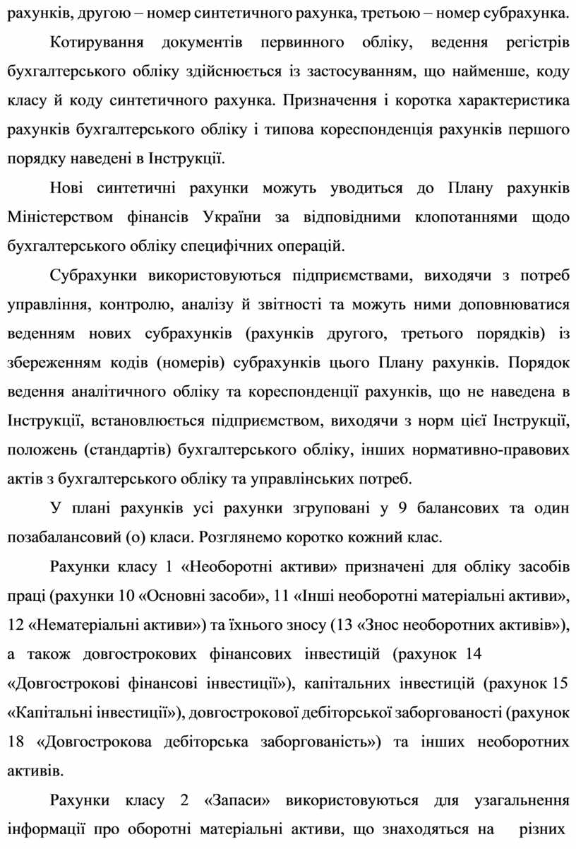 У плані рахунків усі рахунки згруповані у 9 балансових та один позабалансовий (о) класи. Розглянемо коротко кожний клас.