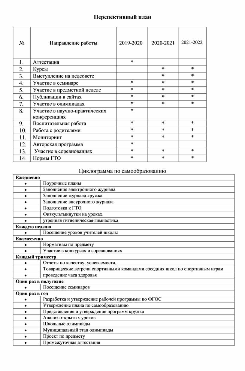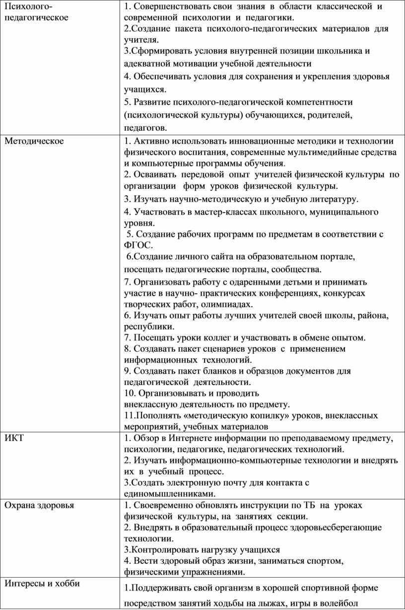 1. Активно использовать инновационные методики и технологии физического воспитания, современные мультимедийные средства и компьютерные программы обучения. 2. Осваивать передовой опыт учителей физической культуры по организации форм уроков физической культуры. 3. Изучать научно-методическую и учебную литературу. 4. Участвовать в мастер-классах школьного, муниципального уровня. 5. Создание рабочих программ по предметам в соответствии с ФГОС. 6.Создание личного сайта на образовательном портале, посещать педагогические порталы, сообщества. 7. Организовать работу с одаренными детьми и принимать участие в научно- практических конференциях, конкурсах творческих работ, олимпиадах. 6. Изучать опыт работы лучших учителей своей школы, района, республики. 7. Посещать уроки коллег и участвовать в обмене опытом. 8. Создавать пакет сценариев уроков с применением информационных технологий. 9. Создавать пакет бланков и образцов документов для педагогической деятельности. 10. Организовывать и проводить внеклассную деятельность по предмету. 11.Пополнять «методическую копилку» уроков, внеклассных мероприятий, учебных материалов |