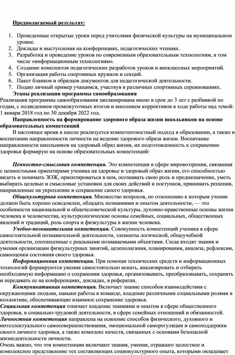 Создание рабочих программ по предметам в соответствии с ФГОС. Участие в семинарах учителей физической культуры. Выступления на заседаниях ШМО (из опыта работы), «Требования к современному уроку», участие в предметных неделях. Участие в олимпиадах, соревнованиях, фестивалях. Публикации в социальной сети работников образования разработок уроков и внеклассных мероприятий, выступлений, творческих и практических работ, в том числе учащихся. |