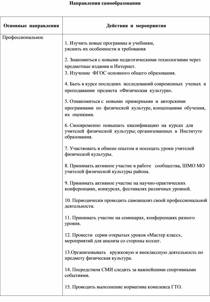 1. Изучить новые программы и учебники, уяснить их особенности и требования 2. Знакомиться с новыми педагогическими технологиями через предметные издания и Интернет. 3. Изучение ФГОС основного общего образования. 4. Быть в курсе последних исследований современных ученых в преподавании предмета «Физическая культура». 5. Ознакомиться с новыми примерными и авторскими программами по физической культуре, концепциями обучения, их оценками. 6. Своевременно повышать квалификацию на курсах для учителей физической культуры; организованных в Институте образования.