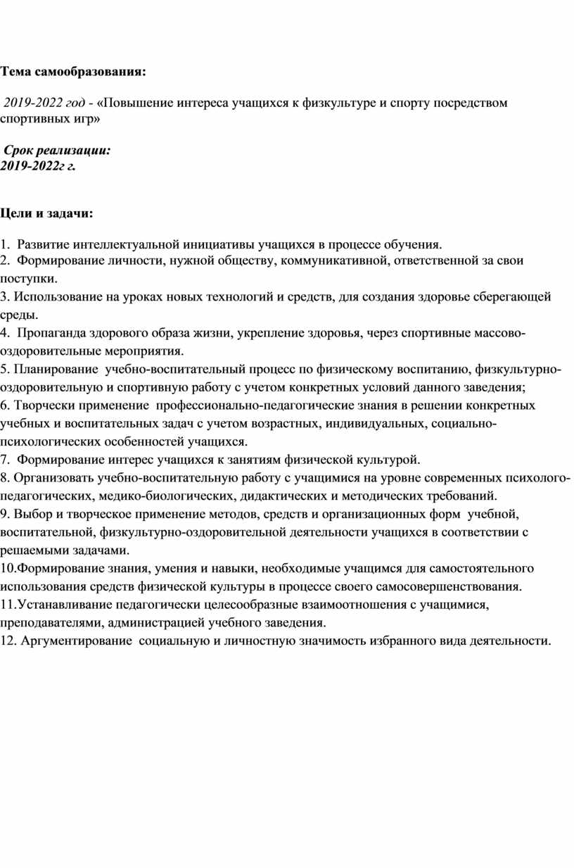2019-2022 год - «Повышение интереса учащихся к физкультуре и спорту посредством спортивных игр»