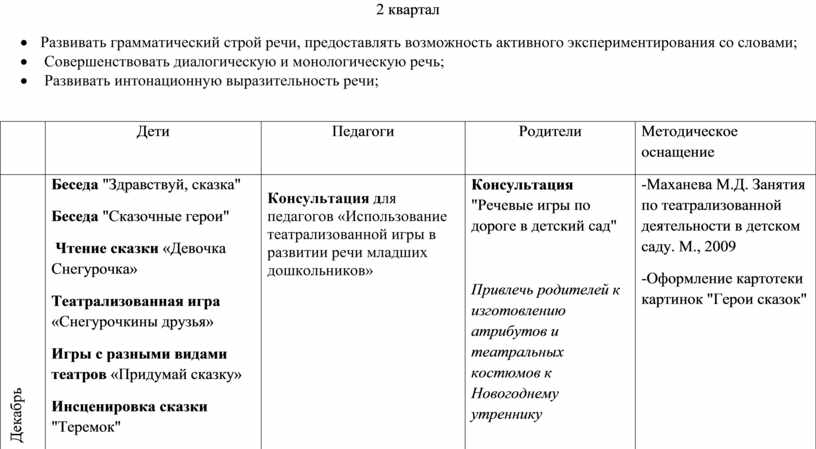 Беседа "Здравствуй, сказка" Беседа "Сказочные герои" Чтение сказки «Девочка Снегурочка» Театрализованная игра «Снегурочкины друзья» Игры с разными видами театров «Придумай сказку» Инсценировка сказки "Теремок" |
