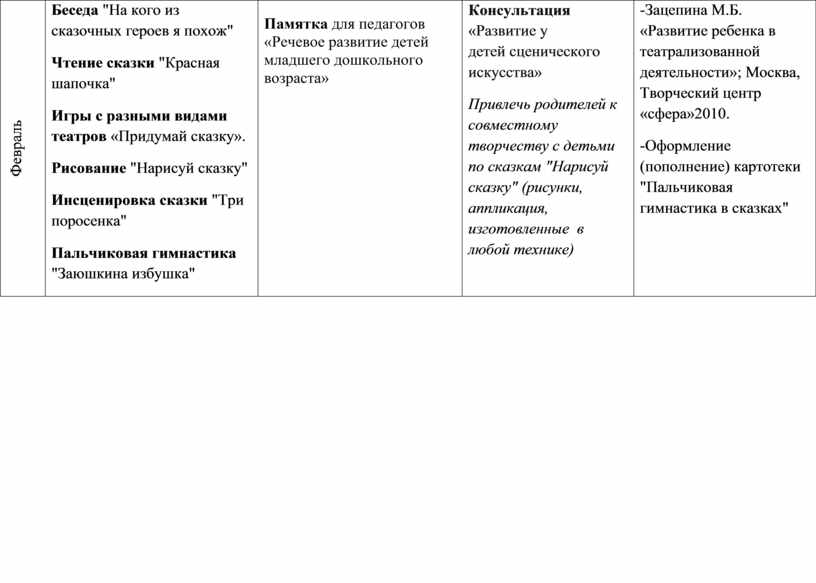 -Зацепина М.Б. «Развитие ребенка в театрализованной деятельности»; Москва, Творческий центр «сфера»2010. -Оформление (пополнение) картотеки "Пальчиковая гимнастика в сказках" |