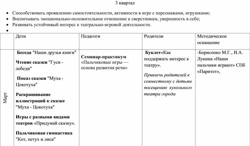 Беседа "Наши друзья книги" Чтение сказки "Гуси - лебеди" Показ сказки "Муха - Цокотуха" Раскрашивание иллюстраций к сказке "Муха - Цокотуха" Игры с разными видами театров «Придумай сказку». Пальчиковая гимнастика "Кот, петух и лиса" |