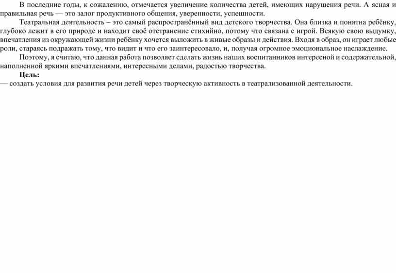 Театральная деятельность – это самый распространённый вид детского творчества. Она близка и понятна ребёнку, глубоко лежит в его природе и находит своё отстранение стихийно, потому что связана с игрой. Всякую свою выдумку, впечатления из окружающей жизни ребёнку хочется выложить в живые образы и действия. Входя в образ, он играет любые роли, стараясь подражать тому, что видит и что его заинтересовало, и, получая огромное эмоциональное наслаждение.
