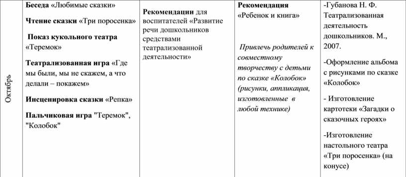 -Губанова Н. Ф. Театрализованная деятельность дошкольников. М., 2007. -Оформление альбома с рисунками по сказке «Колобок» - Изготовление картотеки «Загадки о сказочных героях» -Изготовление настольного театра «Три поросенка» (на конусе) |