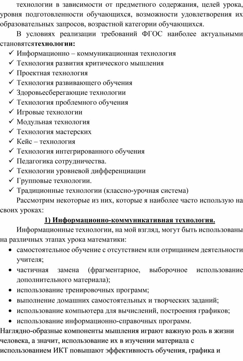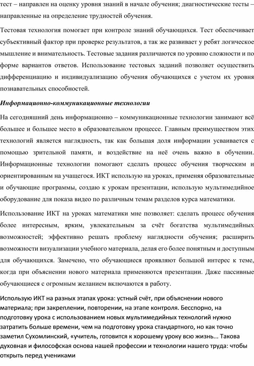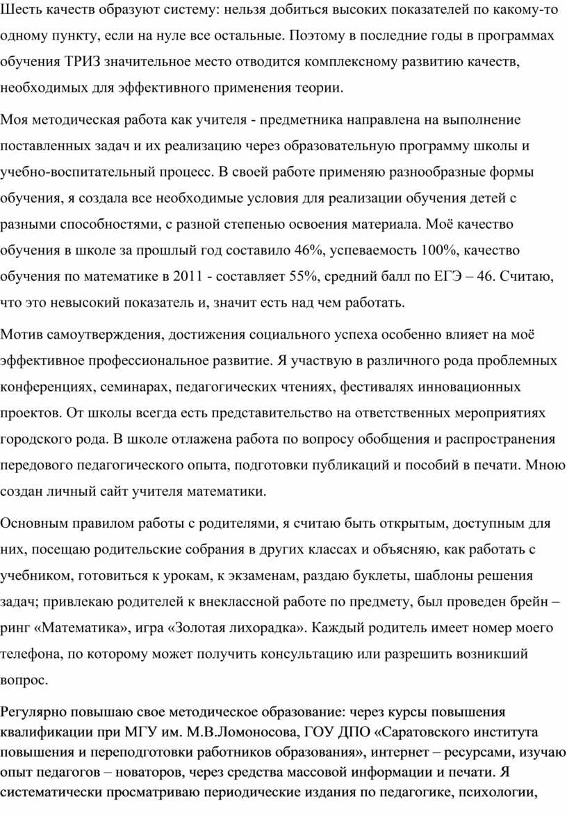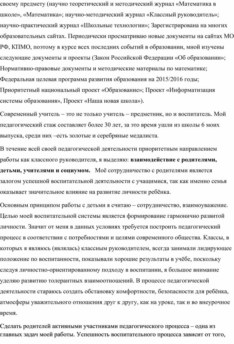 Регулярно повышаю свое методическое образование: через курсы повышения квалификации при МГУ им. М.В.Ломоносова, ГОУ ДПО «Саратовского института повышения и переподготовки работников образования», интернет – ресурсами, изучаю опыт педагогов – новаторов, через средства массовой информации и печати. Я систематически просматриваю периодические издания по педагогике, психологии, своему предмету (научно теоретический и методический журнал «Математика в школе», «Математика»; научно-методический журнал «Классный руководитель»; научно-практический журнал «Школьные технологии»; Зарегистрирована на многих образовательных сайтах. Периодически просматриваю новые документы на сайтах МО РФ, КПМО, поэтому в курсе всех последних событий в образовании, мной изучены следующие документы и проекты (Закон Российской Федерации «Об образовании»; Нормативно-правовые документы и методические материалы по математике; Федеральная целевая программа развития образования на 2015/2016 годы; Приоритетный национальный проект «Образование»; Проект «Информатизация системы образования», Проект «Наша новая школа»).