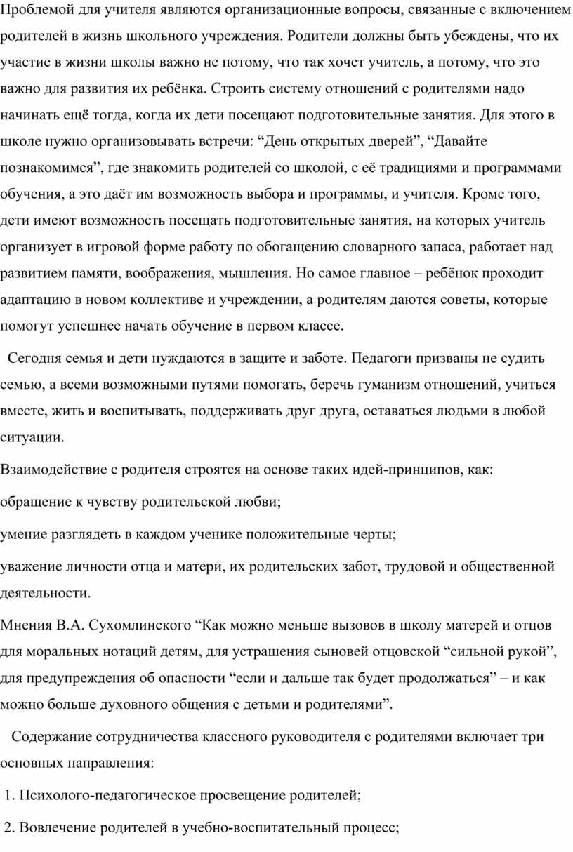Содержание сотрудничества классного руководителя с родителями включает три основных направления: