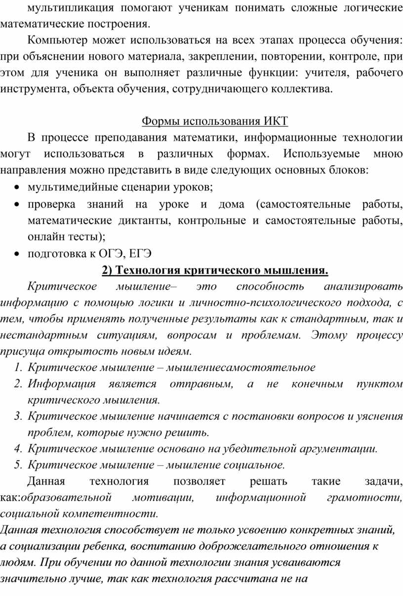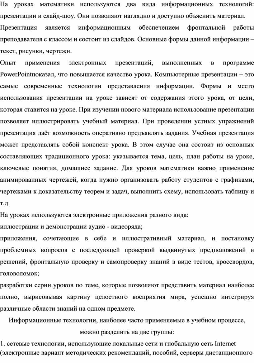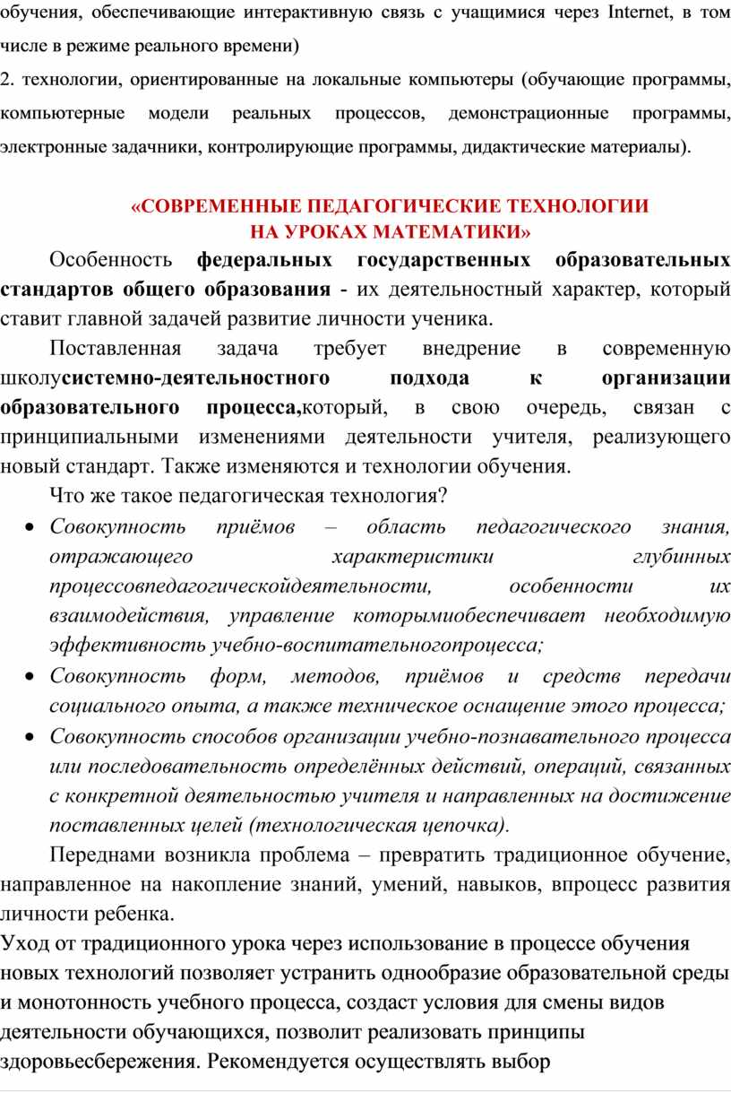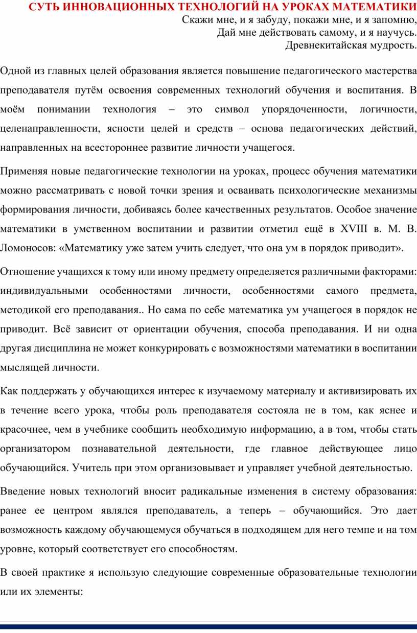 выработка методических рекомендаций по применению инновационных технологий на уроках математики;