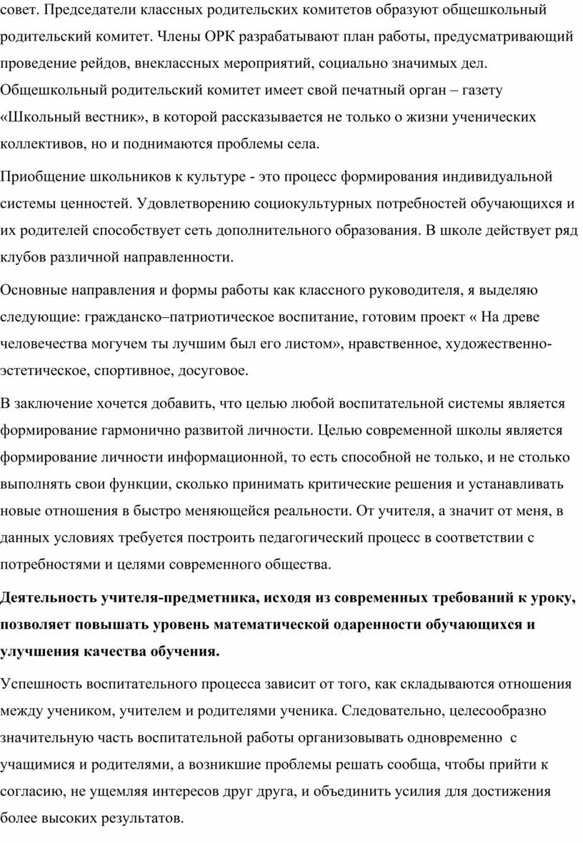 участие родителей класса в работе родительского комитета и в работе Совета школы.