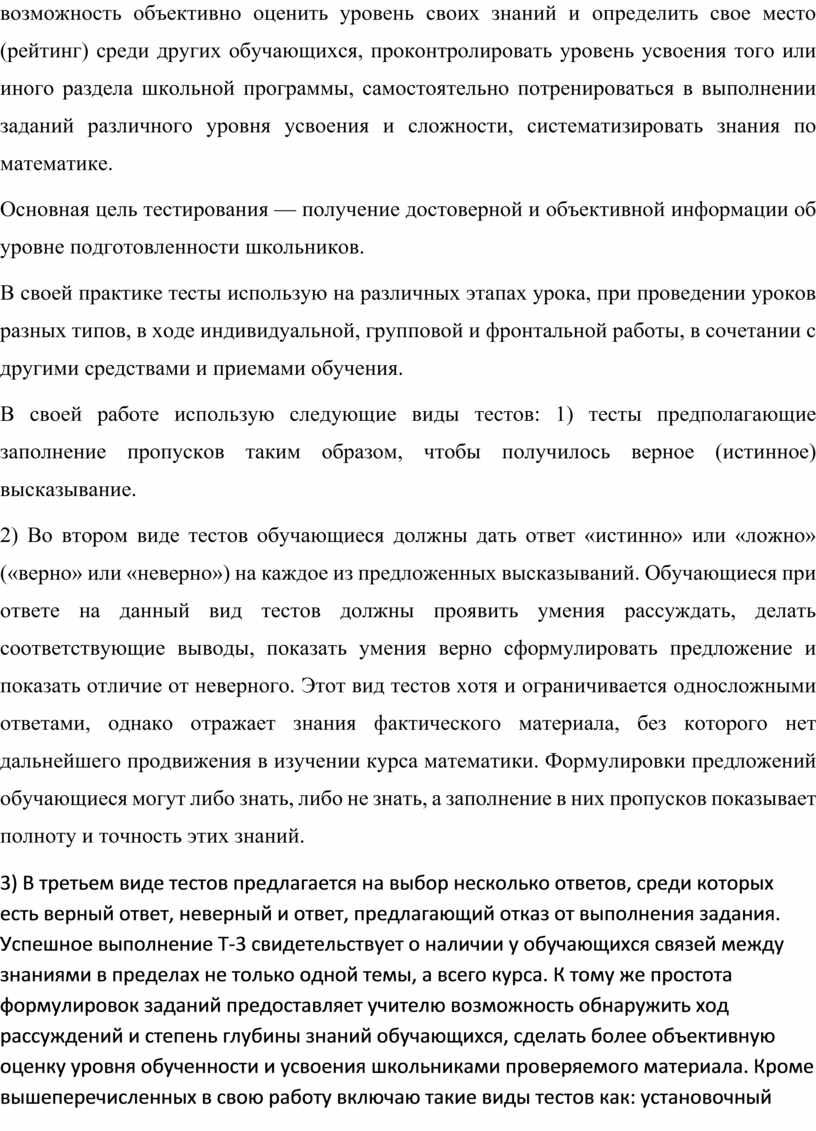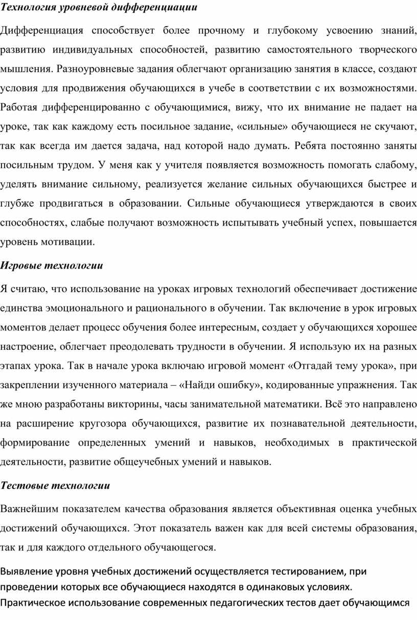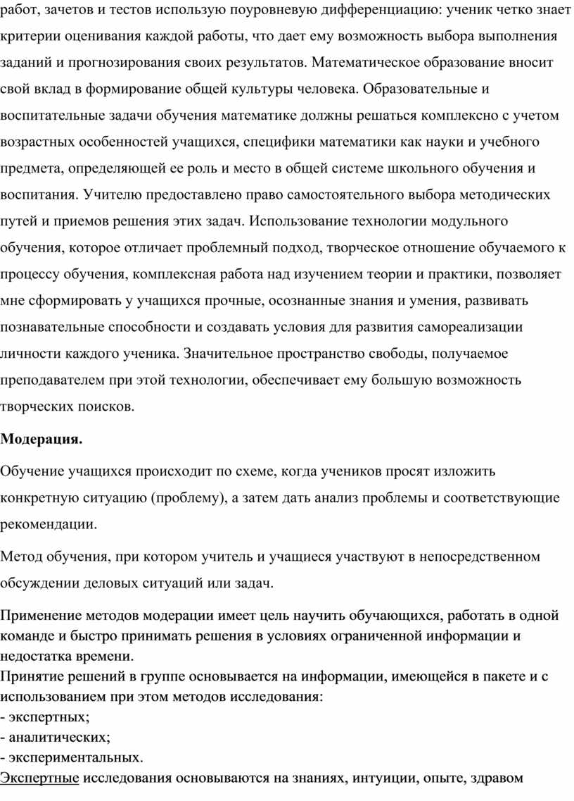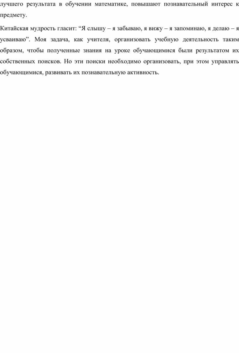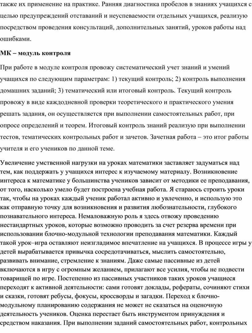Моя методическая работа как учителя - предметника направлена на выполнение поставленных задач и их реализацию через образовательную программу школы и учебно-воспитательный процесс. В своей работе применяю разнообразные формы обучения, я создала все необходимые условия для реализации обучения детей с разными способностями, с разной степенью освоения материала. Моё качество обучения в школе за прошлый год составило 46%, успеваемость 100%, качество обучения по математике в 2011 - составляет 55%, средний балл по ЕГЭ – 46. Считаю, что это невысокий показатель и, значит есть над чем работать.