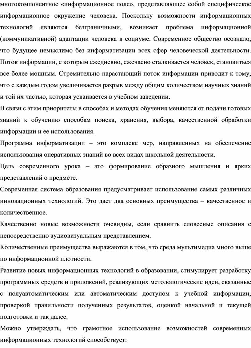 В настоящий момент происходит процесс «семиотизации» общества – появления и развитие многочисленных знаковых систем, благодаря которым образуется многокомпонентное «информационное поле», представляющее собой специфическое информационное окружение человека. Поскольку возможности информационных технологий являются безграничными, возникает проблема информационной (коммуникативной) адаптации человека в социуме. Современное общество осознало, что будущее немыслимо без информатизации всех сфер человеческой деятельности. Поток информации, с которым ежедневно, ежечасно сталкивается человек, становиться все более мощным. Стремительно нарастающий поток информации приводит к тому, что с каждым годом увеличивается разрыв между общим количеством научных знаний и той их частью, которая усваивается в учебном заведении.