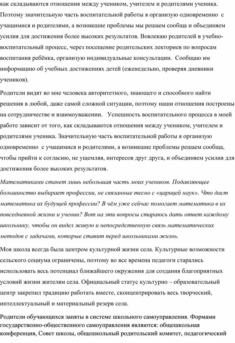 Родители видят во мне человека авторитетного, знающего и способного найти решения в любой, даже самой сложной ситуации, поэтому наши отношения построены на сотрудничестве и взаимоуважении. Успешность воспитательного процесса в моей работе зависит от того, как складываются отношения между учеником, учителем и родителями ученика. Значительную часть воспитательной работы я организую одновременно с учащимися и родителями, а возникшие проблемы решаем сообща, чтобы прийти к согласию, не ущемляя, интересов друг друга, и объединяем усилия для достижения более высоких результатов.