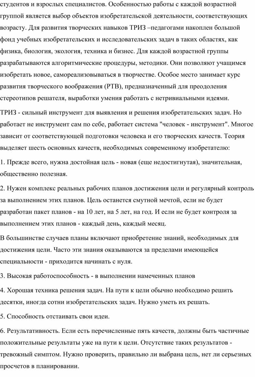 Шесть качеств образуют систему: нельзя добиться высоких показателей по какому-то одному пункту, если на нуле все остальные. Поэтому в последние годы в программах обучения ТРИЗ значительное место отводится комплексному развитию качеств, необходимых для эффективного применения теории.