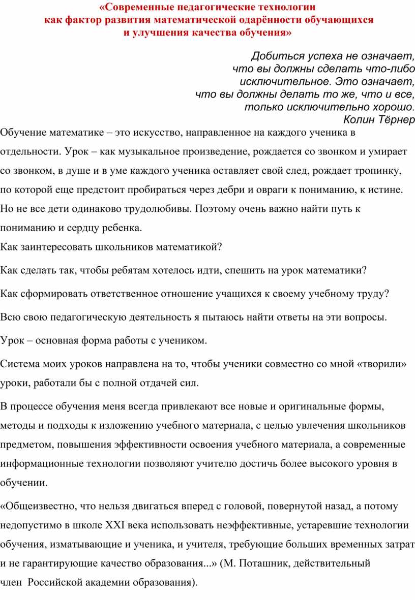 Деятельность учителя-предметника, исходя из современных требований к уроку, позволяет повышать уровень математической одаренности обучающихся и улучшения качества обучения.