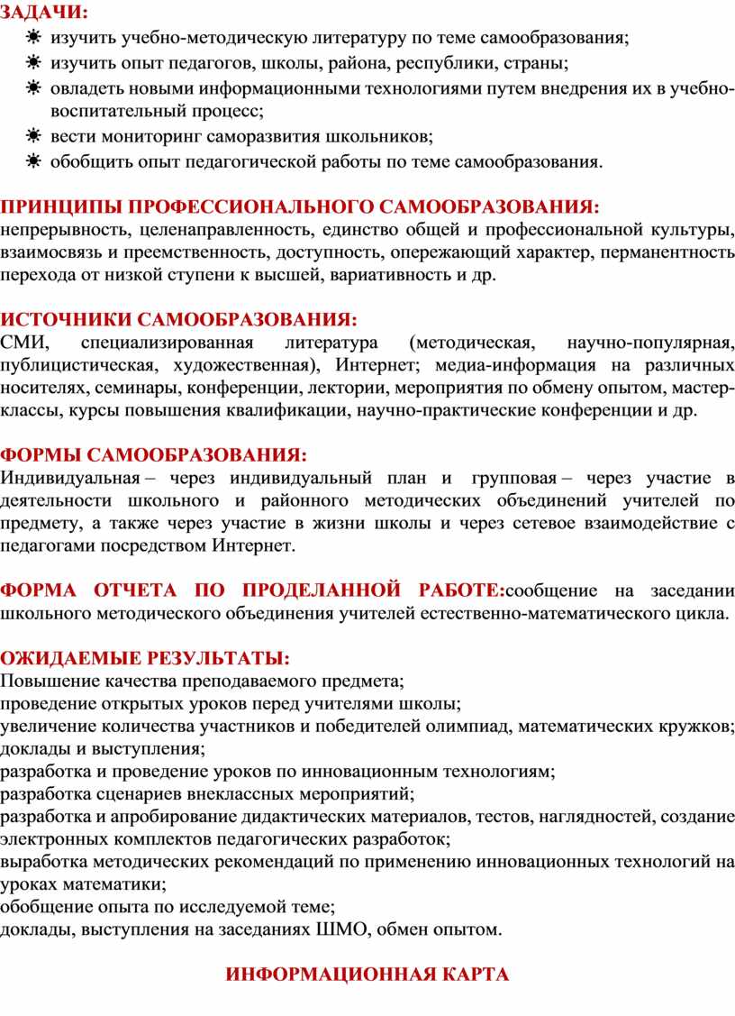 ☀ изучить учебно-методическую литературу по теме самообразования;