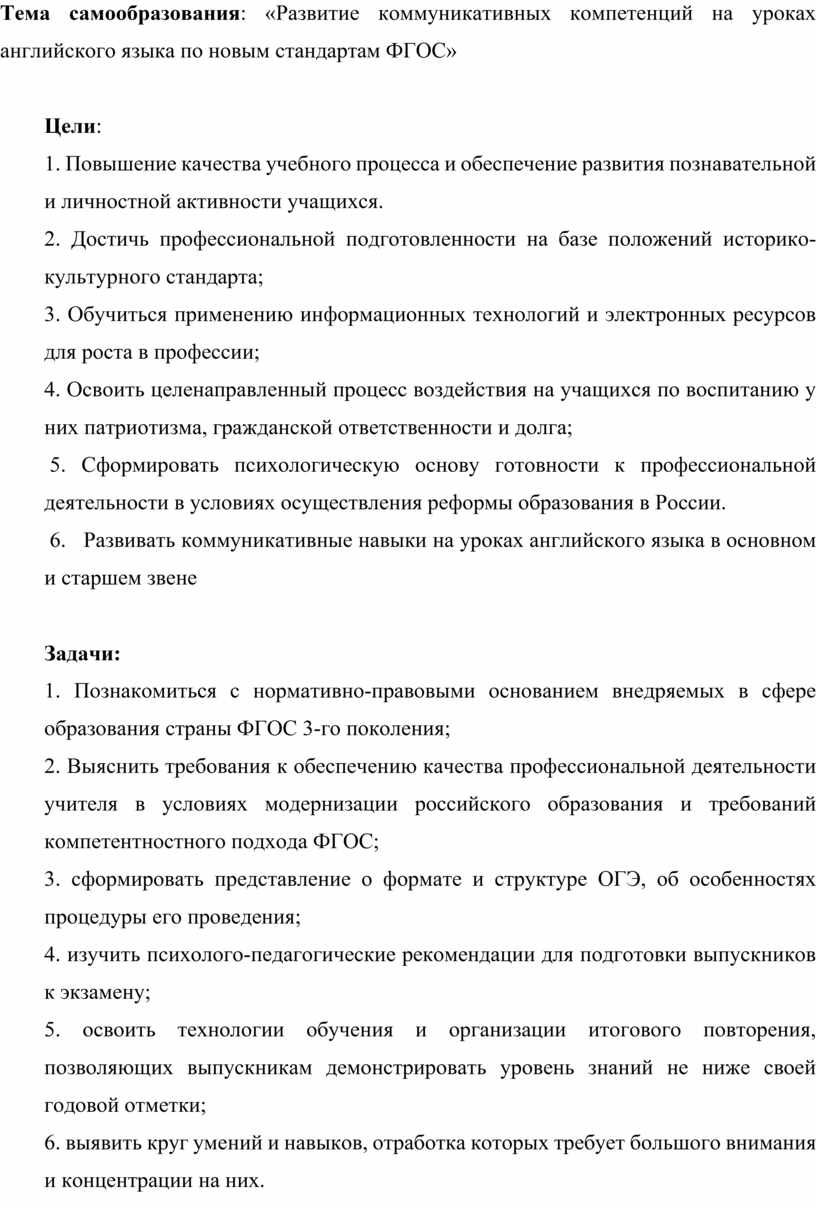 Тема самообразования: «Развитие коммуникативных компетенций на уроках английского языка по новым стандартам ФГОС»