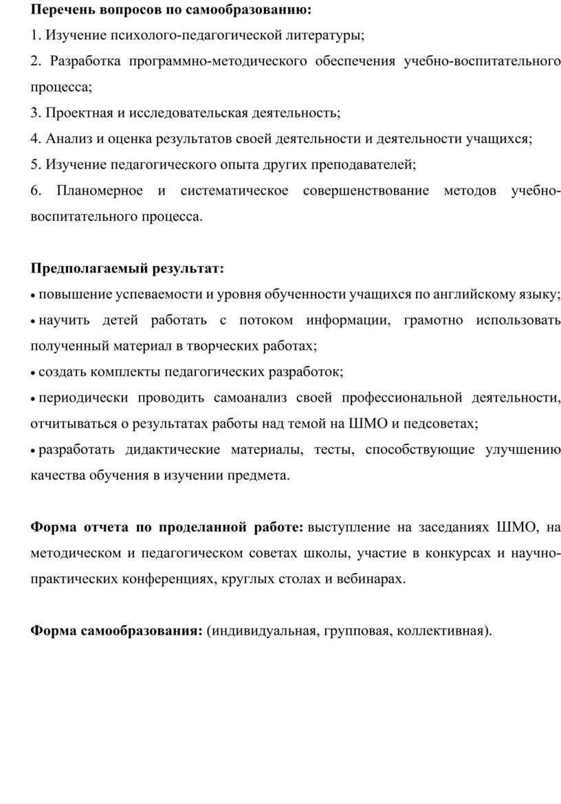 Форма самообразования: (индивидуальная, групповая, коллективная).