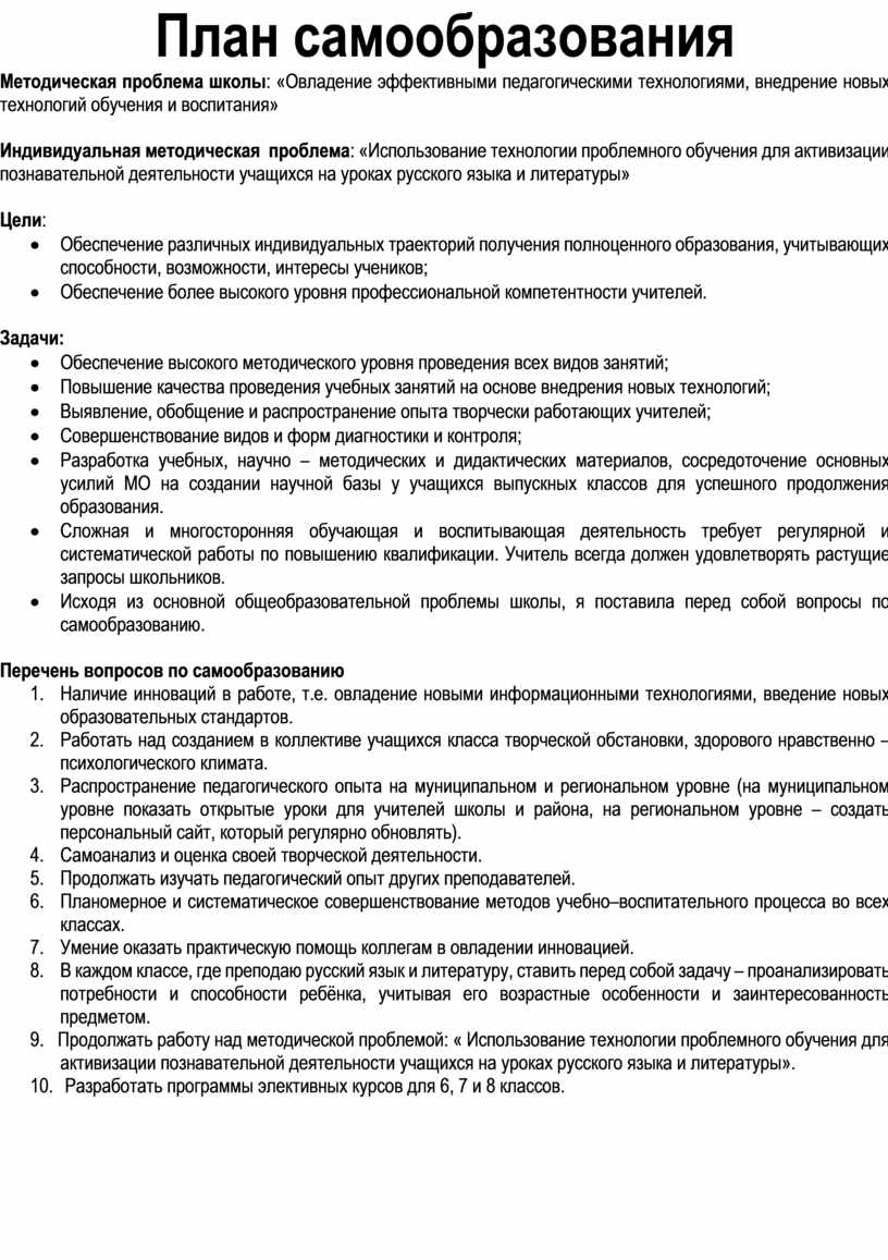 Индивидуальная методическая проблема: «Использование технологии проблемного обучения для активизации познавательной деятельности учащихся на уроках русского языка и литературы»