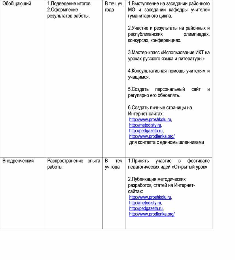 3. Распространение педагогического опыта на муниципальном и региональном уровне (на муниципальном уровне показать открытые уроки для учителей школы и района, на региональном уровне – создать персональный сайт, который регулярно обновлять).