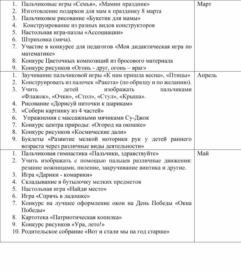 1. Пальчиковая гимнастика «Пальчики, здравствуйте» 2. Учить изображать с помощью пальцев различные движения: резание ножницами, пиление, закручивание винтика и другие. 3. Игра «Дарики - комарики» 4. Складывание в бутылочку мелких предметов 5. Настольная игра «Найди место» 6. Игра «Спрячь в ладошке» 7. Конкурс на лучшее оформление окон на День Победы «Окна Победы» 8. Картотека «Патриотическая копилка» 9. Конкурс рисунков «Ура, лето!» 10. Родительское собрание «Вот и стали мы на год старше»