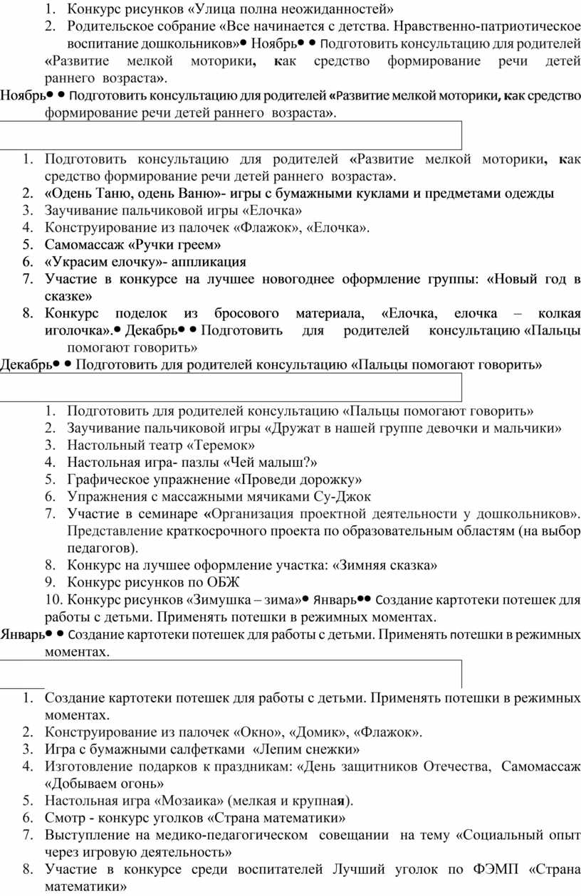 1. Подготовить консультацию для родителей «Развитие мелкой моторики у детей раннего возраста». 2. Пальчиковый театр «Колобок» 3. Д/и «Сухой бассейн»». 4. Настольная игра «Домашний уголок», «Чья тень?» (крупные пазлы). 5. Игры с прищепками. 6. «Собери бусы для мамы»-шнуровка 7. Участие в семинаре «Развитие логического мышления у детей дошкольного возраста, через дидактические игры». Презентация игры по логическому мышлению 8. Конкурс чтецов «Я о маме стихами расскажу» 9. Конкурс рисунков «Улица полна неожиданностей» 10. Родительское собрание «Все начинается с детства. Нравственно-патриотическое воспитание дошкольников» |