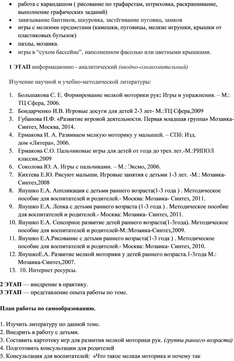 1.Тема самообразования: «Развитие мелкой моторики у детей раннего возраста через различные виды деятельности»