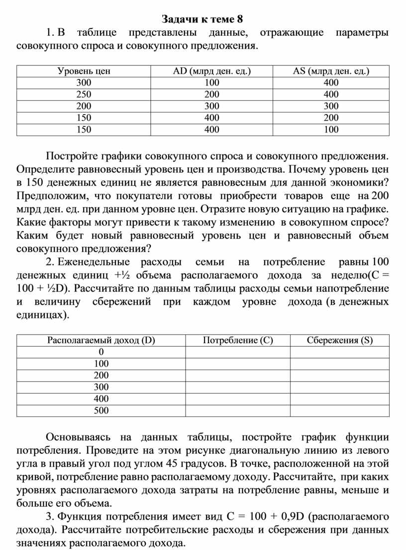 1. В таблице представлены данные, отражающие параметры совокупного спроса и совокупного предложения.