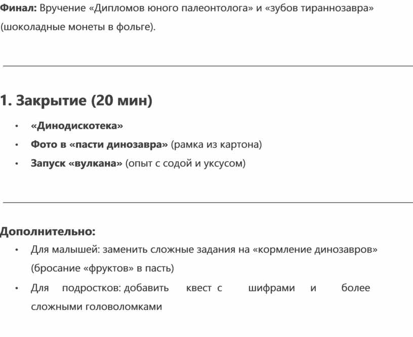 Финал: Вручение «Дипломов юного палеонтолога» и «зубов тираннозавра» (шоколадные монеты в фольге).