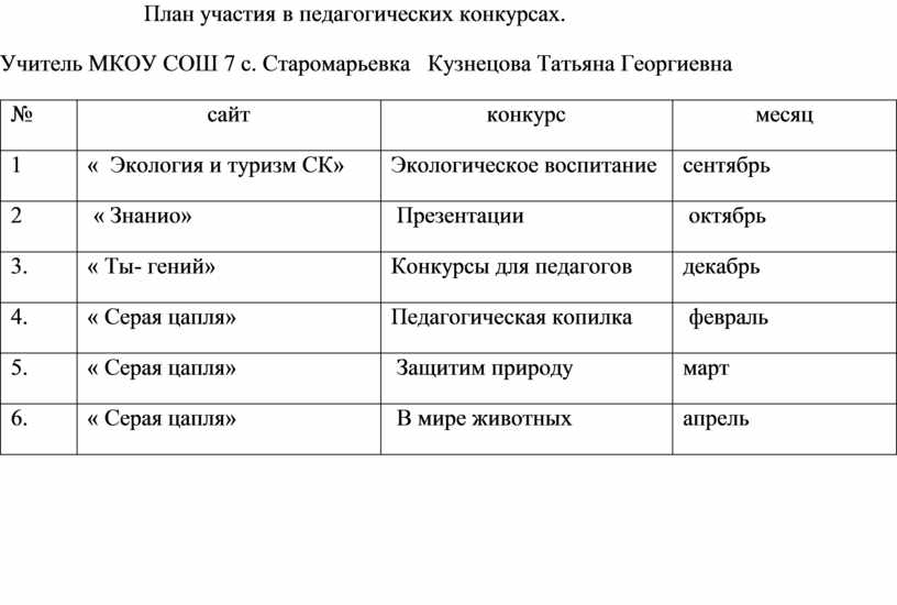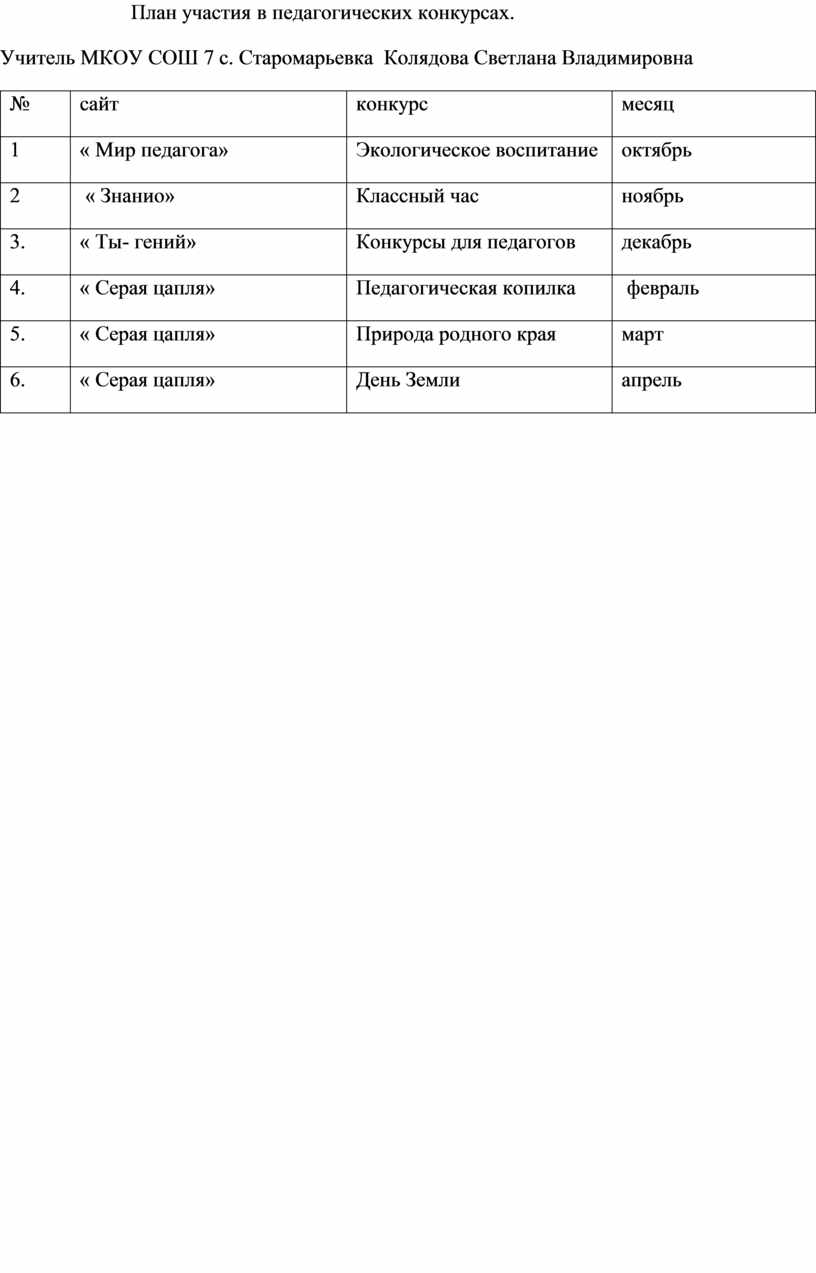 План участия в педагогических конкурсах.