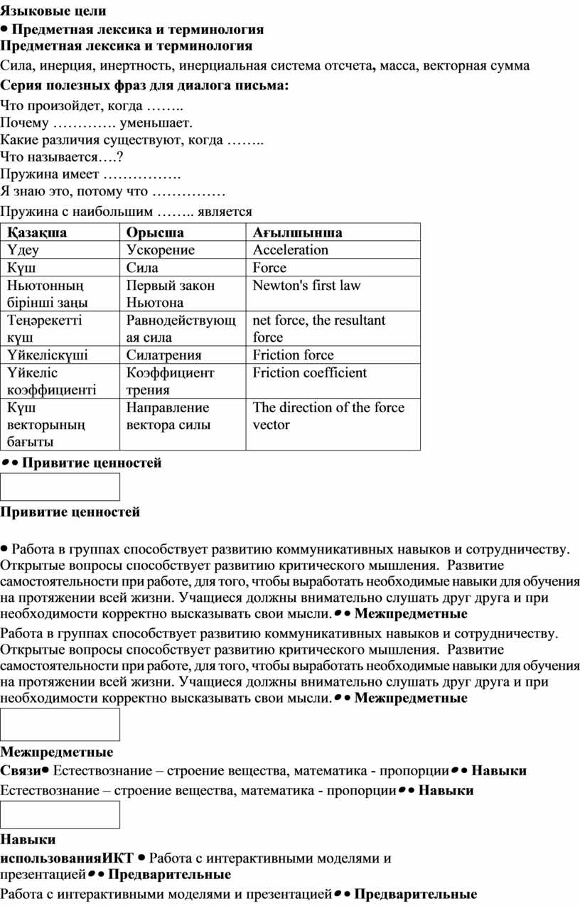 Работа в группах способствует развитию коммуникативных навыков и сотрудничеству. Открытые вопросы способствует развитию критического мышления. Развитие самостоятельности при работе, для того, чтобы выработать необходимые навыки для обучения на протяжении всей жизни. Учащиеся должны внимательно слушать друг друга и при необходимости корректно высказывать свои мысли. |