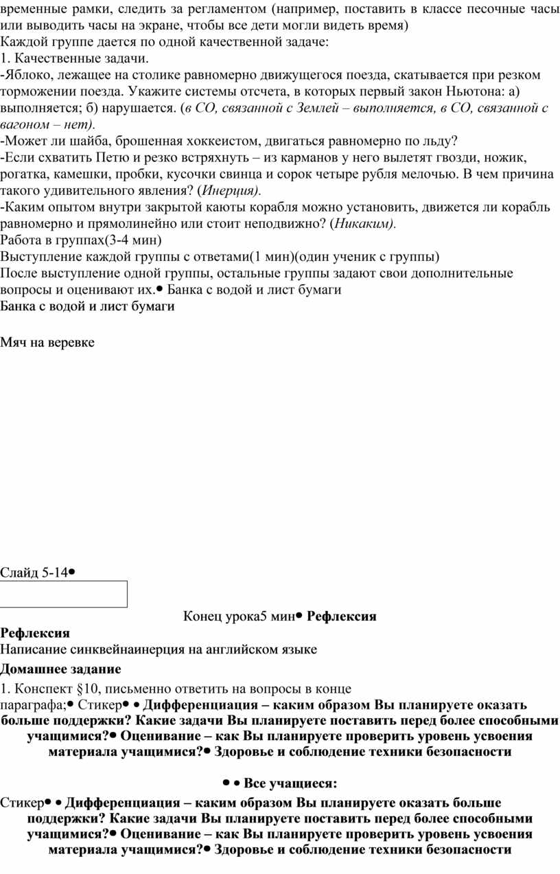 Обсуждение: Автобус и легковая машина едут с одинаковой скоростью. Но тормозные пути разные. Почему? Ученики отвечают на вопрос. И с помощью полученных знаний, ученики пришли выводом и записали конспект. Закон инерции (Галилей) Если на тело не действуют другие тела, то оно, либо находится в покое, либо движется прямолинейно и равномерно. Инерция. Инерция – это физическое явление. Оно состоит в том, что любое тело, на которое не действуют другие тела (или действие других тел скомпенсировано), сохраняет состояние покоя или движется равномерно и прямолинейно. Инертность.Инертность– свойство тел, характеризующая их способность по-разному изменять скорость с течением времени. Оно состоит в том, что для изменения скорости тела требуется некоторое время. Более инертно то тело, скорость которого изменяется медленнее. ПЕРВЫЙ ЗАКОН НЬЮТОНА. - Первый закон механики, или закон инерции, как его часто называют, был установлен еще Галилеем. Первым сформулировал его Рене Декарт, современник Галилея. Декарт так же, как и Галилей не знал о законе Всемирного тяготения и описал этот закон интуитивно. В 1644 г. в своей работе «Начала философии» , он так выразил закон инерции: 1) всякая вещь продолжает по возможности пребывать в одном и том же состоянии и изменяет его не иначе, как от встречи с другой; 2) каждая материальная частица в отдельности стремится продолжать дальнейшее движение не по кривой, а исключительно по прямой. - Но строгую формулировку этого закона дал и включил его в число основных законов физики Ньютон. Закон инерции относится к самому простому случаю движения – движению тела, на которое не оказывают другие тела. Такие тела называют свободными телами. После того как учащиеся ,они могут сформулировать такое понятие как Инерциальное система отчета. - Системы отсчета в которых выполняется первый закон ньютона называют ИСО. Систему отсчета, связанную с Землей можно приближенно считать ИСО, но гораздо точнее брать за ИСО, связанную с Солнцем. Строго говоря, Солнце и Земля не являются ИСО. На самом деле, система, связанная с Землей, неинерциальна. На тела в ней действуют силы, которых в природе не существует – силы инерции. Поэтому на экваторе вес тела меньше, чем на полюсе; реки подмывают в северном полушарии правые берега, а в южном – левые; снаряд, выпущенный из пушки со строго вертикальным стволом, падая не попадает обратно в ствол, как это должно было бы случиться в ИСО, а отклонится в сторону и т.д. - Но эффекты, вызванные этой неинерциальностью, незначительны. В ряде случаев ими пренебрегают (но далеко не всегда). - Кроме того, нельзя поставить ни одного опыта, который бы в чистом виде показал, как движется тело, если на него не действуют другие тела. Но имеется один выход: надо поставить тело в условия, при котором влияние внешних воздействий можно делать все меньше и меньше, и наблюдать, к чему это ведет. Закрепление. Групповая работа Разделить на группы, в которых есть ученики разного уровня успеваемости, чтобы дети помогали друг другу во время урока. При этом все группы одного уровня. Обязательно ставить четкие и понятные временные рамки, следить за регламентом (например, поставить в классе песочные часы или выводить часы на экране, чтобы все дети могли видеть время) Каждой группе дается по одной качественной задаче: 1. Качественные задачи. · -