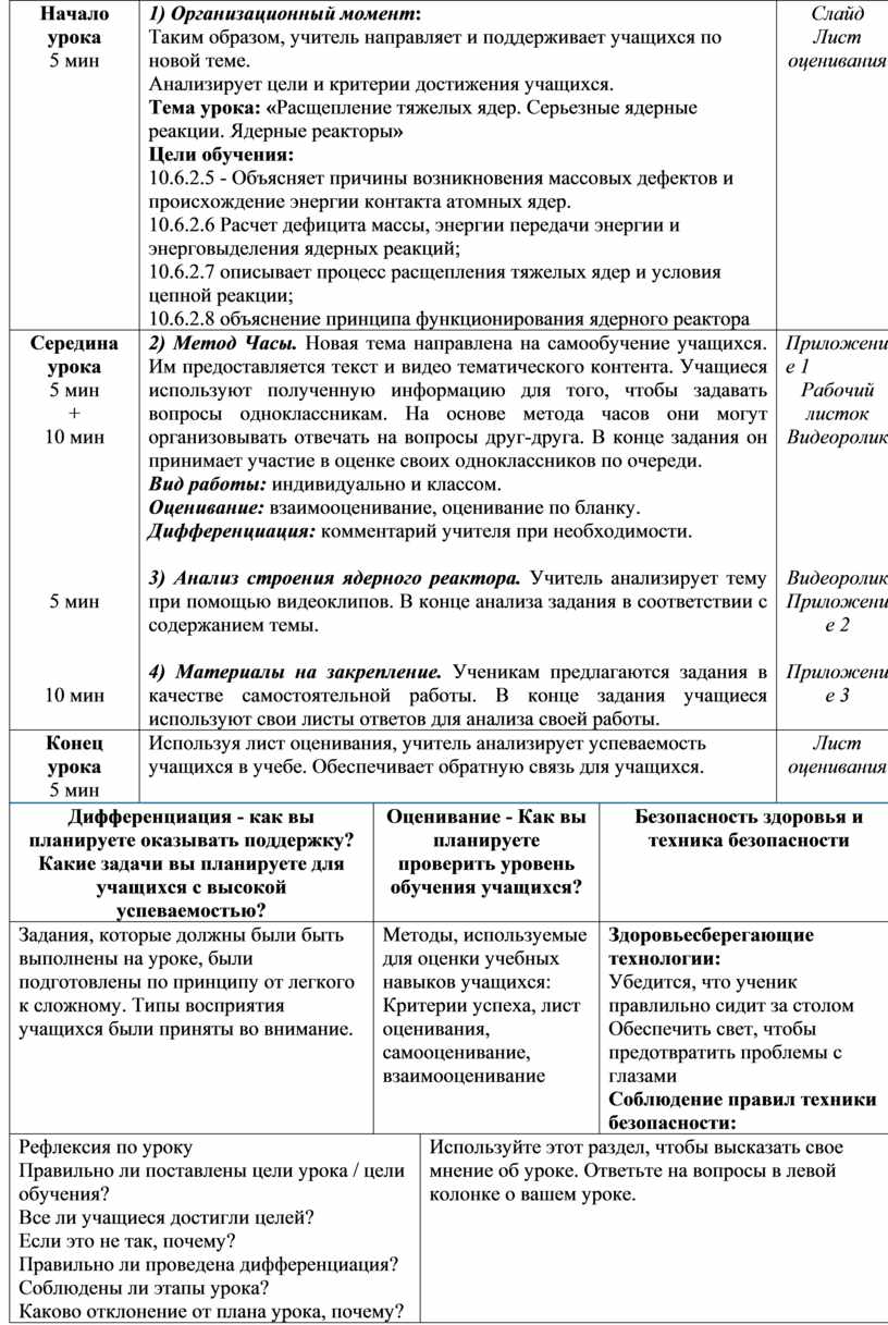 1) Организационный момент: Таким образом, учитель направляет и поддерживает учащихся по новой теме. Анализирует цели и критерии достижения учащихся. Тема урока: «Расщепление тяжелых ядер. Серьезные ядерные реакции. Ядерные реакторы» Цели обучения: 10.6.2.5 - Объясняет причины возникновения массовых дефектов и происхождение энергии контакта атомных ядер. 10.6.2.6 Расчет дефицита массы, энергии передачи энергии и энерговыделения ядерных реакций; 10.6.2.7 описывает процесс расщепления тяжелых ядер и условия цепной реакции; 10.6.2.8 объяснение принципа функционирования ядерного реактора |