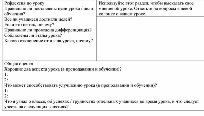 Используйте этот раздел, чтобы высказать свое мнение об уроке. Ответьте на вопросы в левой колонке о вашем уроке. |