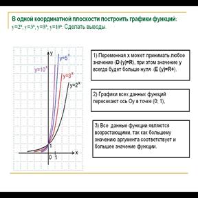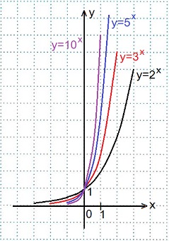 2) Графики всех данных функций пересекают ось Оу в точке (0; 1), так как любое число в нулевой степени равно единице; с осью Ох графики не пересекаются, так как положительное число в любой степени не может быть равным нулю. Чем больше основание а (если a>1) показательной функции у=ах, тем ближе расположена кривая к оси Оу.