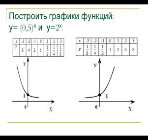 График функции у=2х мы уже строили, графики остальных функций строим аналогично, причем, достаточно будет найти значения функций при х=0 и при х=±1.