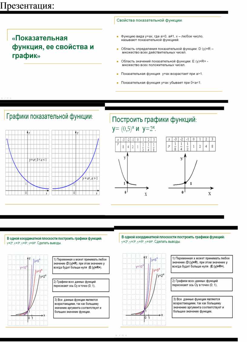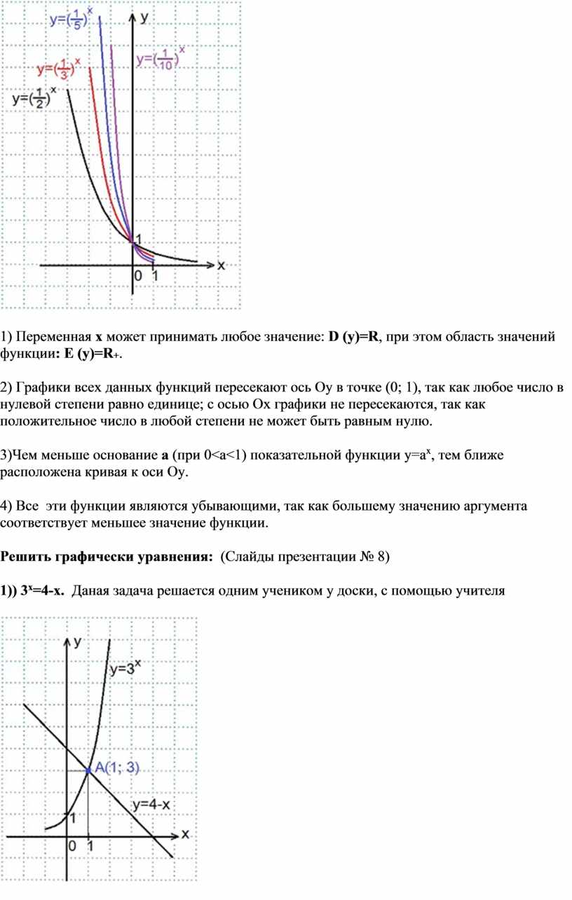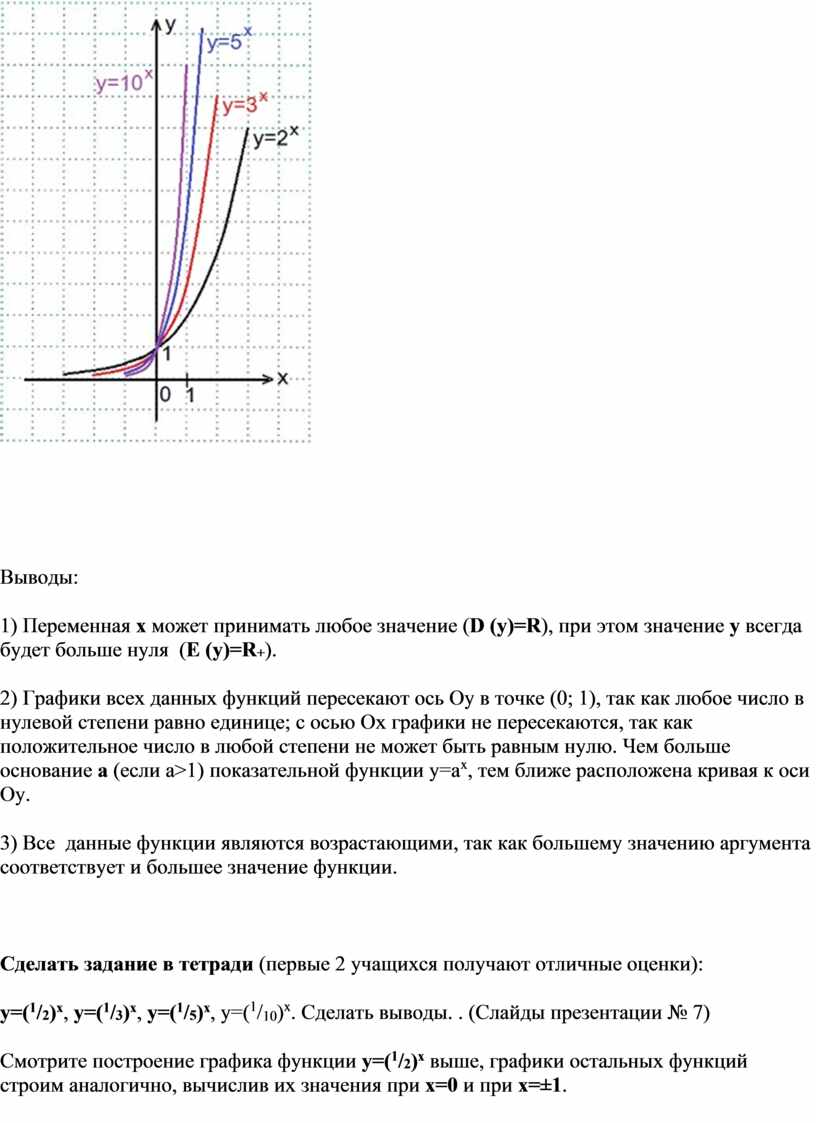2) Графики всех данных функций пересекают ось Оу в точке (0; 1), так как любое число в нулевой степени равно единице; с осью Ох графики не пересекаются, так как положительное число в любой степени не может быть равным нулю.