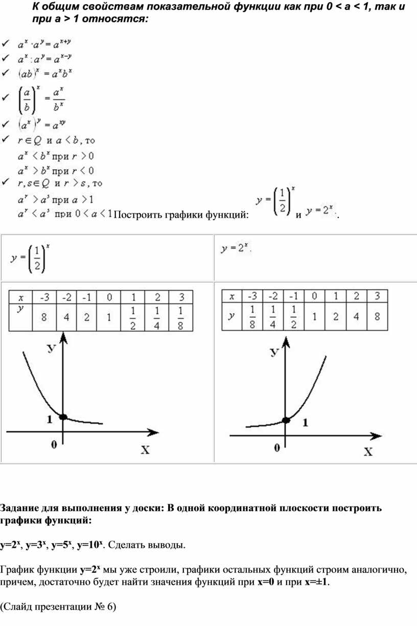 К общим свойствам показательной функции как при 0 < a < 1, так и при a > 1 относятся: